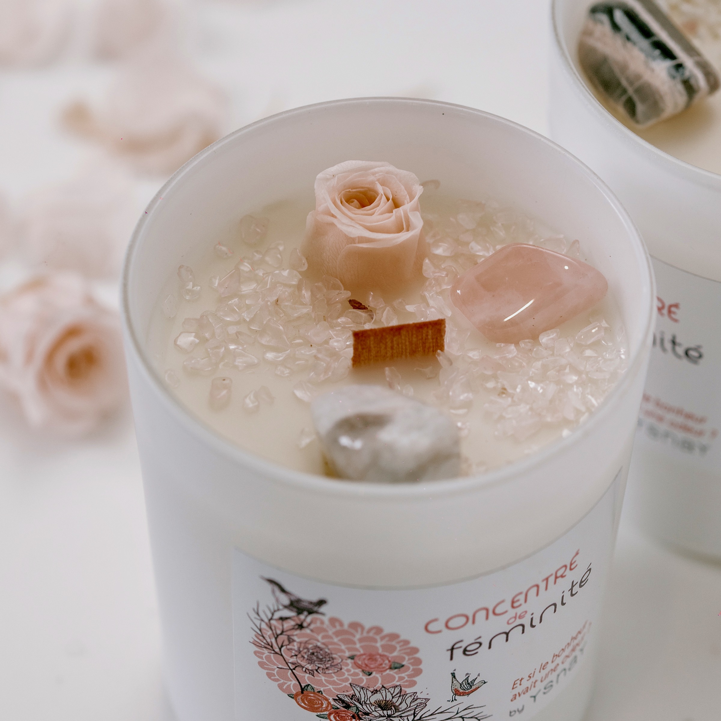 La bougie « CONCENTRÉ DE FÉMINITÉ » éveille ou réveille notre délicatesse et notre féminité tout en douceur, aide à mieux ressentir la tendresse et l’amour pour nous-mêmes et nos proches. Nous permet de faire une pause intérieure, loin de la dictature de l’apparence. Séduction, romantisme et douceur.